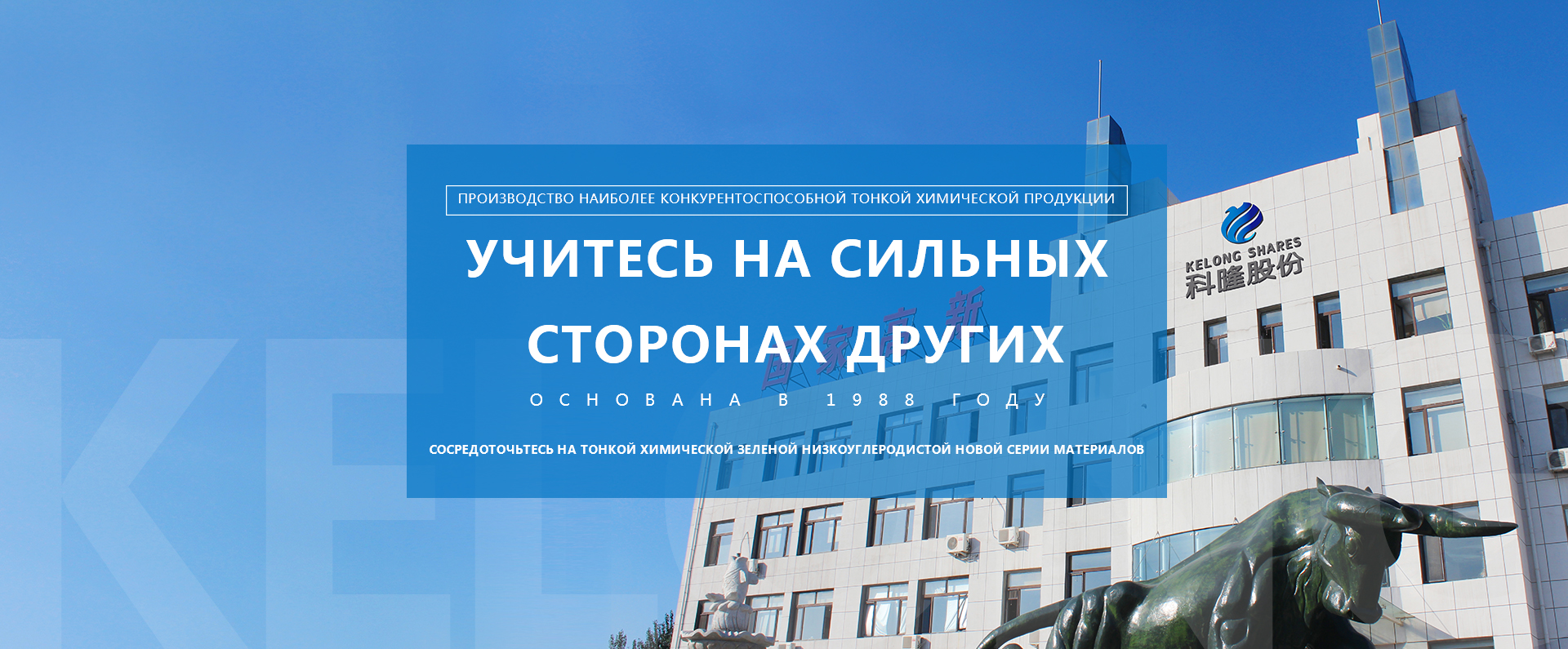 Liaoning Kelong Fine Chemical Co., Ltd. была реструктурирована в 2002 году, после более чем 30 лет развития, превратилась в отечественное профессиональное предприятие по производству тонкой химии, пользующееся хорошей репутацией в отрасли. В начале своего создания компания взяла ?эгоцентризм, обучение на сильных сторонах каждого, интеграцию и утонченность и становление собственной семьей? в качестве своей корпоративной цели, подчеркивая, что ?наука и техника ориентированы на людей, наука и техника служат людям ...